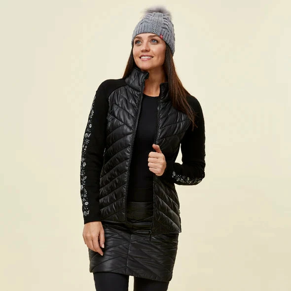 100% Recycled Polyester fabric is insulated with 120gm recycled polyfill, water repellent fabric. Sleeves in a fashionable sweater knit make a great hybrid style.